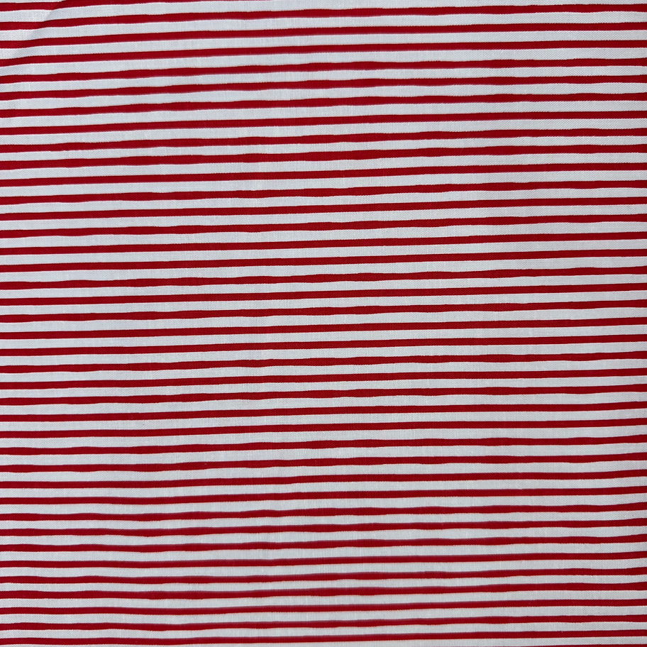 Narrow stripe in red on white background. strip is parallel with selvage edge and would make beautiful binding as well as adding depth to projects.