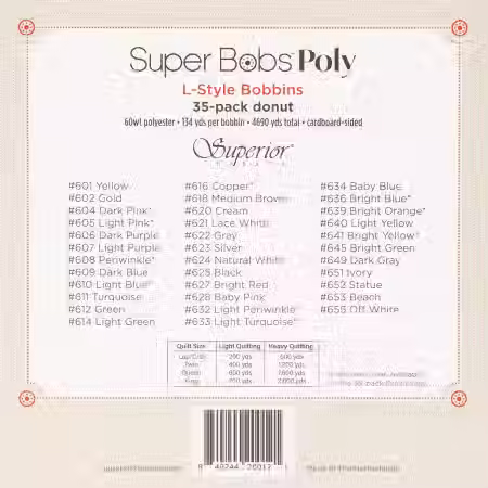 The Super Bobs Poly consists of 35 unique colored, L-style pre-wound bobbins with cardboard sides, packaged in a Bobbin Saver, softer flexible plastic and reusable.
